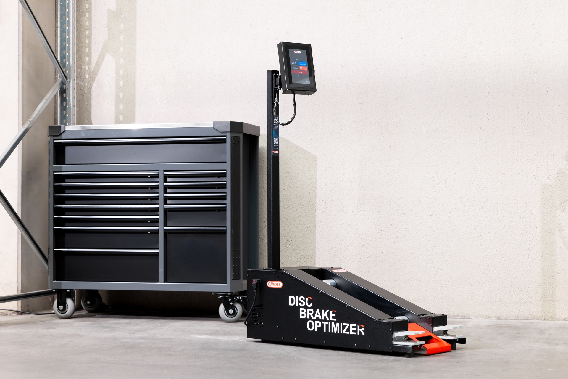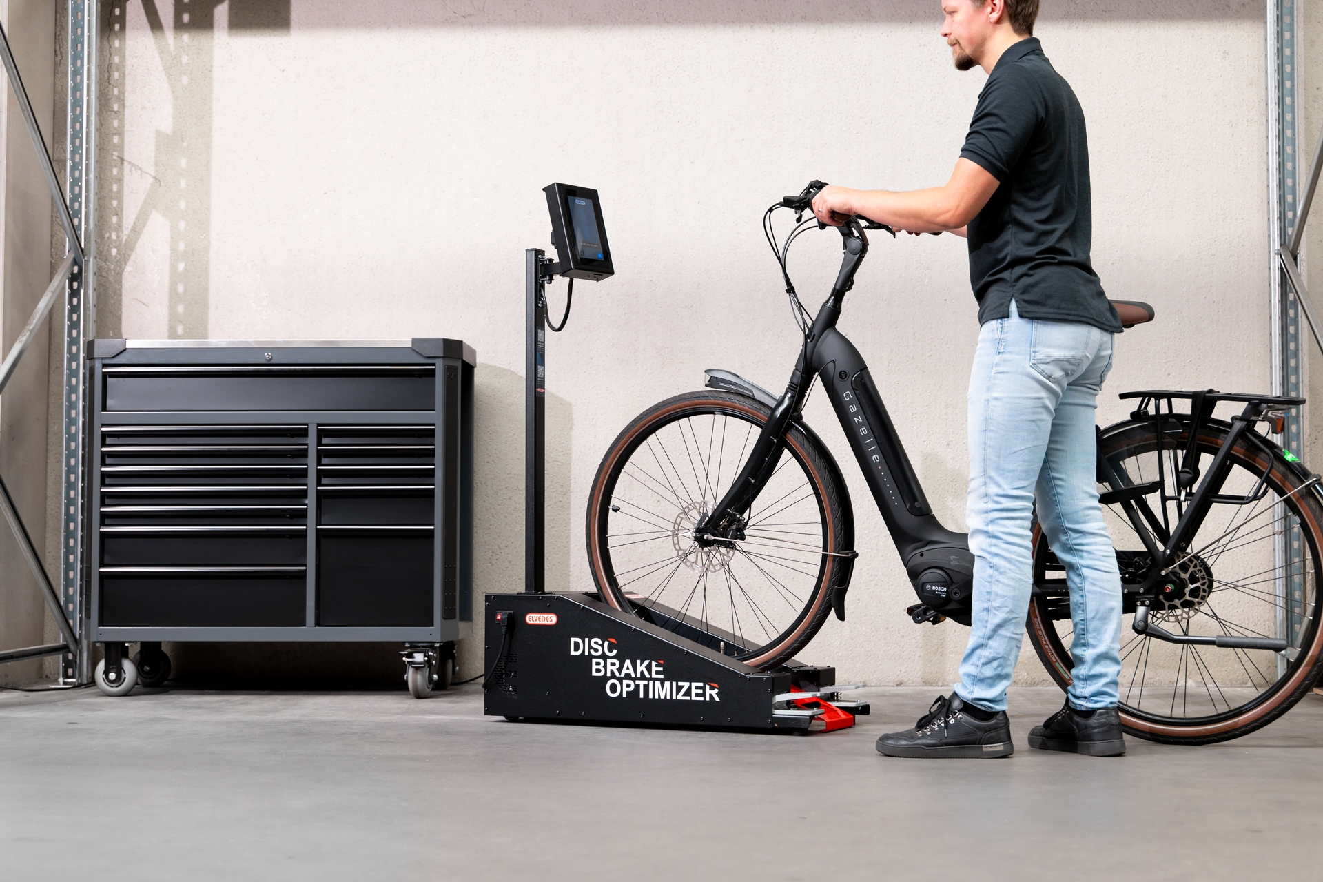 Maximum braking performance doesn´t start on the road - but in the workshop.Anyone who regularly works with modern disc brakes knows: optimum performance requires more than just a proper assembly. The secret is in the details and Elvedes has carefully examined those details. The result? An innovative machine that takes the bedding-in procedure of disc brakes to a next level.Why bedding-in is crucialDisc brakes only function optimally when the contact between pads and brake disc is fully utilised. Viewed under our super microscope, new brake pads and discs are anything but flat: it’s a landscape of peaks and valleys. When bedding-in, the friction material of the pad is rubbed into the pores of the brake disc, resulting in a homogeneous contact surface. Only then the brake is ready to reach its full potential.So while bedding-in is essential, in practice it is still too often underestimated or performed incorrectly. And that is precisely where Elvedes comes in with a professional, reproducible solution.The Elvedes Disc Brake Optimizer: control and feel in one processInstead of bedding-in your brakes while riding a road or trail, Elvedes now offers a machine that guides and simplifies the procedure. The Disc Brake Optimizer was specially developed for workshops that want to guarantee quality and best performance - time after time.What immediately stands out is the well-thought-out design. An integrated ramp and wheels for easy moving of the machine. Furthermore, an adjustable digital display with touchscreen at eye level that guides the mechanic through the programme, step by step. Wheel size, brake pad compound - everything is easily set. The machine then guides the entire bedding-in procedure, but with an important role for the mechanic himself.During braking, the mechanic has to apply the brake manually - exactly at the times the display indicates. A bar then appears on the screen, indicating in real time how much force should be applied to the brake lever. This indication is linked to the resistance created in the machine during braking. This gives the mechanic instant feedback, and each braking movement is accurately matched to the ideal brake-in profile for the chosen brake pad compound.Built for workshop practiceThe Elvedes Disc Brake Optimizer is suitable for all common wheel sizes and tyre widths. It is robustly built and designed for intensive use. Whether racing bikes, mountain bikes, fatbikes or e-bikes: every bike can be safely and quickly fitted with an optimally braked brake system.The result: braking as it should beAfter going through the entire bedding-in procedure with the Elvedes Disc Brake Optimizer, the braking system is immediately ready for use. No more noisy braking, no declining performance in the first few rides. The customer rides off with the certainty that the braking system does exactly what it is supposed to do - from the first metre.In short: the Elvedes Disc Brake Optimizer is not a luxury, but a logical step for workshops striving for the very best results.